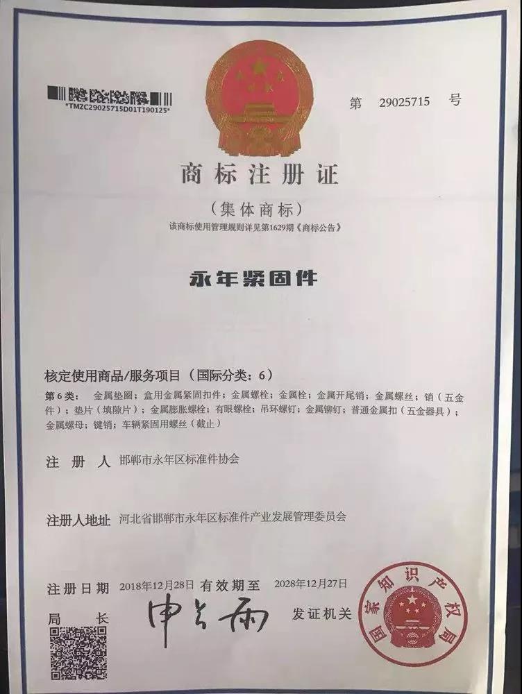 3月4日,经过近1年的时间,国家知识产权局正式批准“永年紧固件”集体商标注册备案。今后,永年的标准件产业拥有了自己的“金字招牌”。